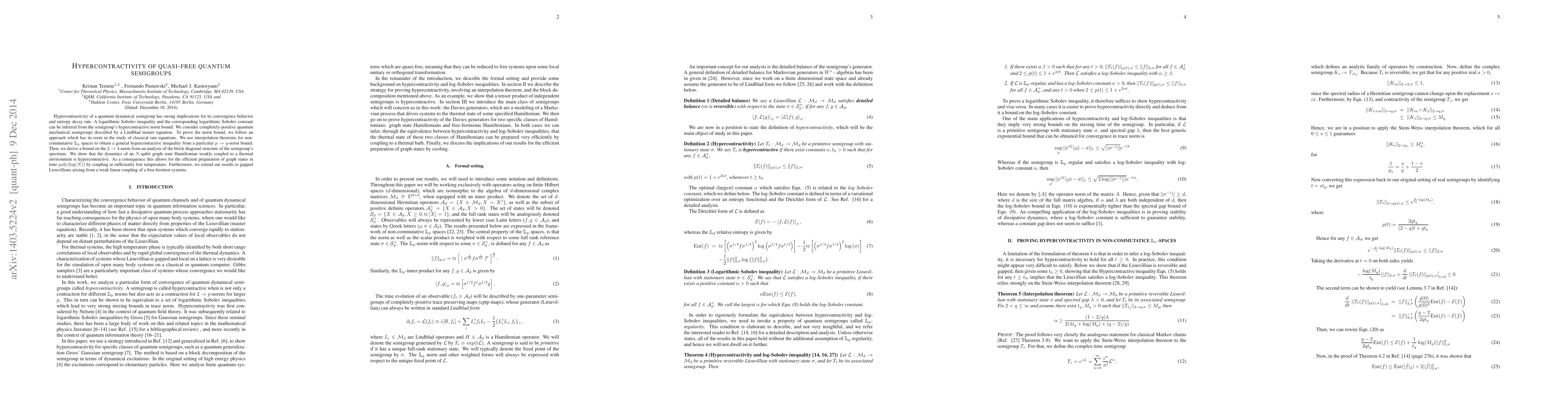 This paper investigates the hypercontractivity of quasi-free quantum semigroups, proving a norm bound for completely-positive quantum mechanical semigroups. The authors derive a logarithmic Sobolev inequality and show that the dynamics of $N$-qubit graph state Hamiltonians weakly coupled to a thermal environment can be efficiently prepared in polynomial time, extending the results to gapped Liouvillians from weak linear couplings of free-fermion systems.