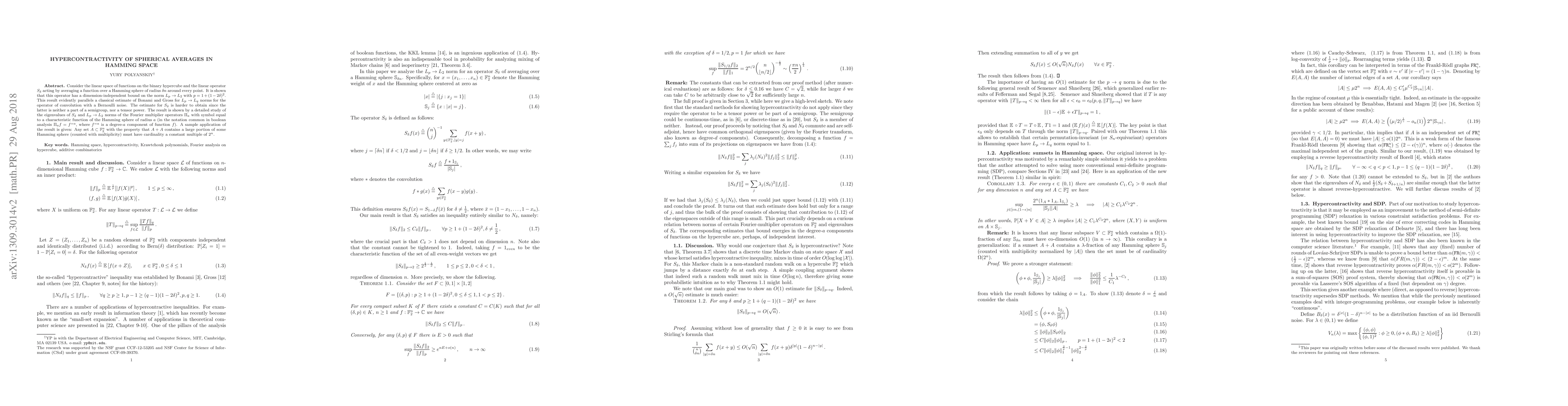 Consider the linear space of functions on the binary hypercube and the linear operator $S_\delta$ acting by averaging a function over a Hamming sphere of radius $\delta n$ around every point. It is shown that this operator has a dimension-independent bound on the norm $L_p \to L_2$ with $p = 1+(1-2\delta)^2$. This result evidently parallels a classical estimate of Bonami and Gross for $L_p \to L_q$ norms for the operator of convolution with a Bernoulli noise. The estimate for $S_\delta$ is harder to obtain since the latter is neither a part of a semigroup, nor a tensor power. The result is shown by a detailed study of the eigenvalues of $S_\delta$ and $L_p\to L_2$ norms of the Fourier multiplier operators $\Pi_a$ with symbol equal to a characteristic function of the Hamming sphere of radius $a$ (in the notation common in boolean analysis $\Pi_a f=f^{=a}$, where $f^{=a}$ is a degree-$a$ component of function $f$). A sample application of the result is given: Any set $A\subset \FF_2^n$ with the property that $A+A$ contains a large portion of some Hamming sphere (counted with multiplicity) must have cardinality a constant multiple of $2^n$.