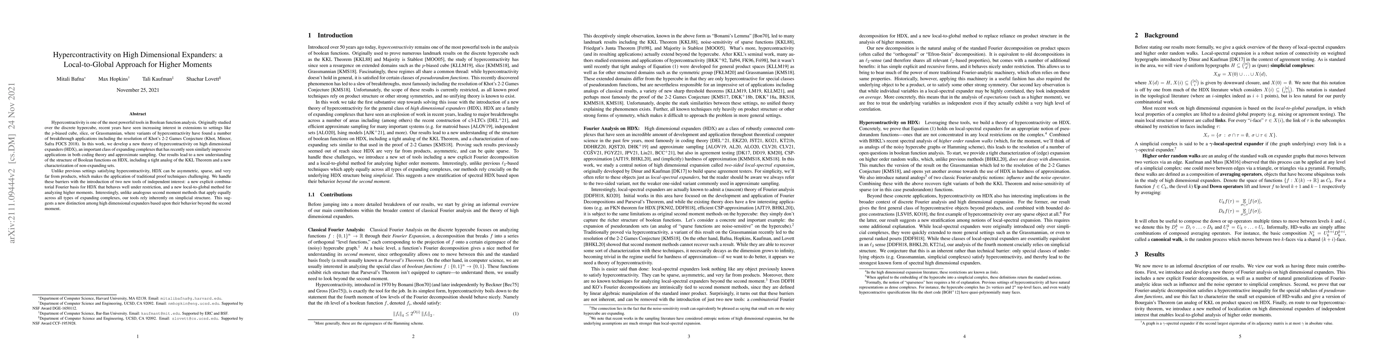 This paper develops a new theory of hypercontractivity on high dimensional expanders (HDX), introducing a combinatorial Fourier basis and a local-to-global approach for higher moments. It provides insights into the structure of Boolean functions on HDX, offering a tight analog of the KKL Theorem and a new characterization of non-expanding sets.