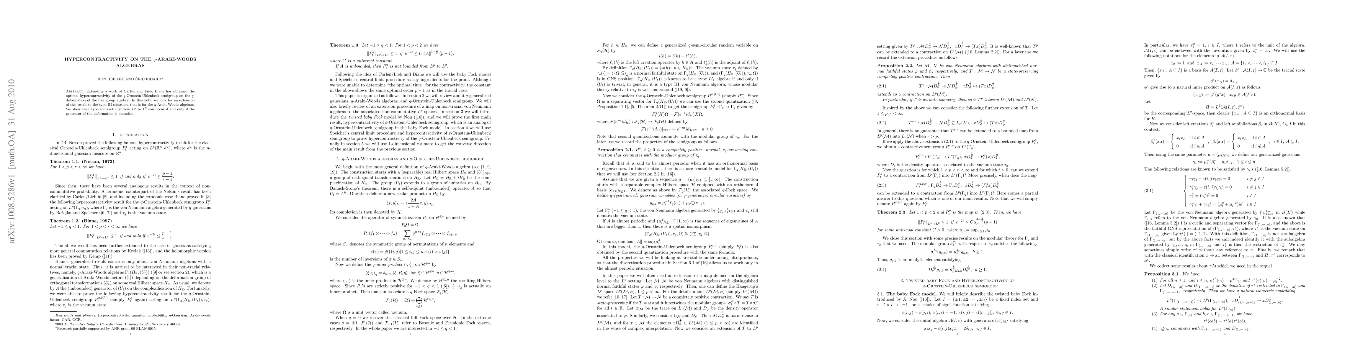 Extending a work of Carlen and Lieb, Biane has obtained the optimal hypercontractivity of the $q$-Ornstein-Uhlenbeck semigroup on the $q$-deformation of the free group algebra. In this note, we look for an extension of this result to the type III situation, that is for the $q$-Araki-Woods algebras. We show that hypercontractivity from $L^p$ to $L^2$ can occur if and only if the generator of the deformation is bounded.