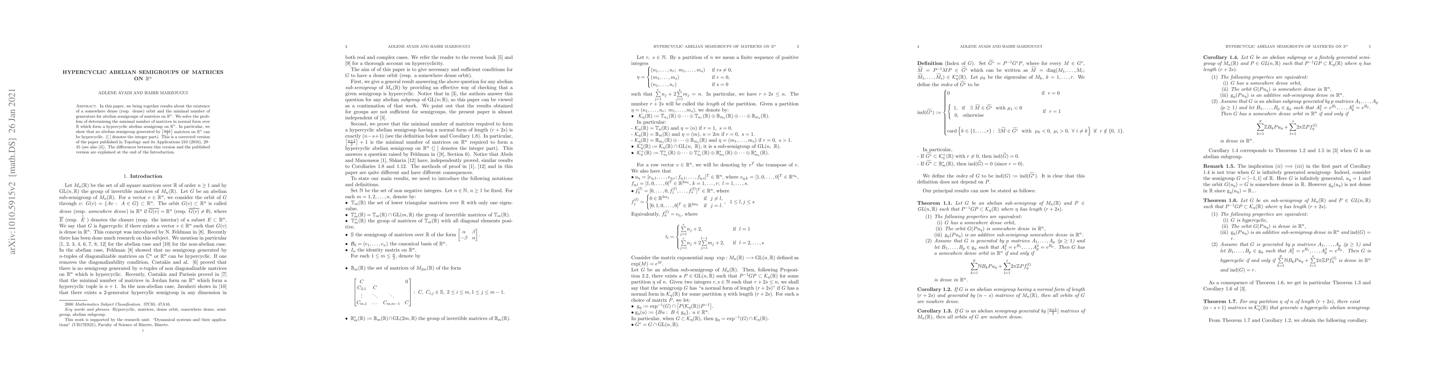 In this paper, we bring together results about the existence of a somewhere dense (resp. dense) orbit and the minimal number of generators for abelian semigroups of matrices on $\mathbb{R}^n$. We solve the problem of determining the minimal number of matrices in normal form over $\mathbb{R}$ which form a hypercyclic abelian semigroup on R^n. In particular, we show that no abelian semigroup generated by $[\frac{n+1}{2}]$ matrices on $\mathbb{R}^n$ can be hypercyclic. ([ ] denotes the integer part). This is a corrected version of the paper published in Topology and its Applications 210 (2016), 29-45 (see also [4]). The differences between this version and the published version are explained at the end of the Introduction.