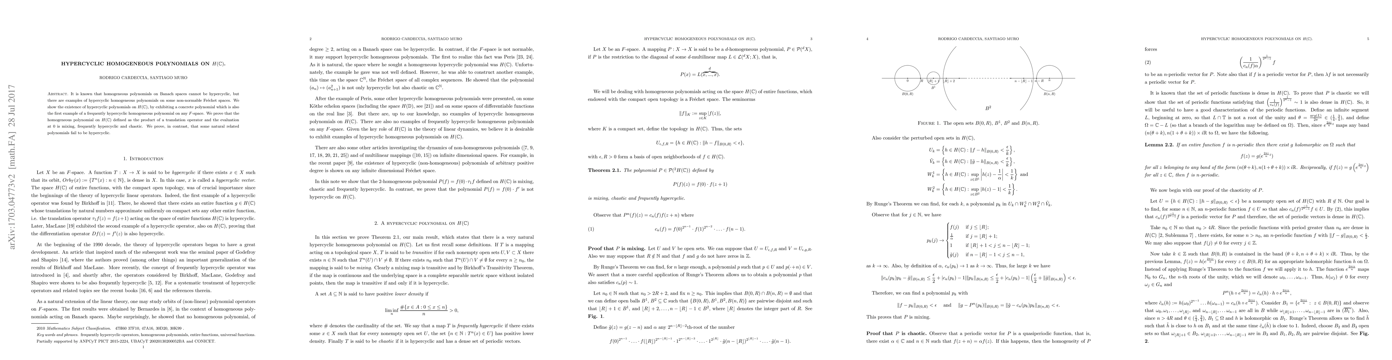 This paper demonstrates the existence of a hypercyclic homogeneous polynomial on $H(\mathbb C)$, specifically a product of a translation operator and evaluation at 0, which is also frequently hypercyclic. It contrasts this finding with other related polynomials that fail to be hypercyclic, highlighting the polynomial's mixing, frequently hypercyclic, and chaotic properties.