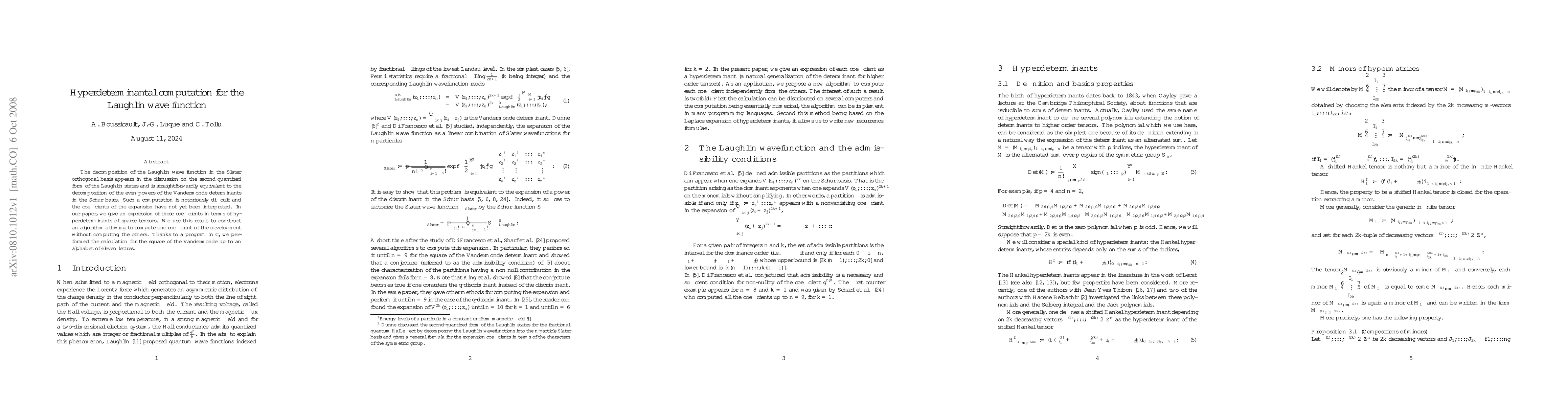 This paper presents a method for computing coefficients in the decomposition of the Laughlin wave function using hyperdeterminants of sparse tensors, enabling the calculation of individual coefficients without needing to compute the entire expansion. The authors implemented a C program to compute these coefficients for the square of the Vandermonde up to an alphabet size of eleven.
