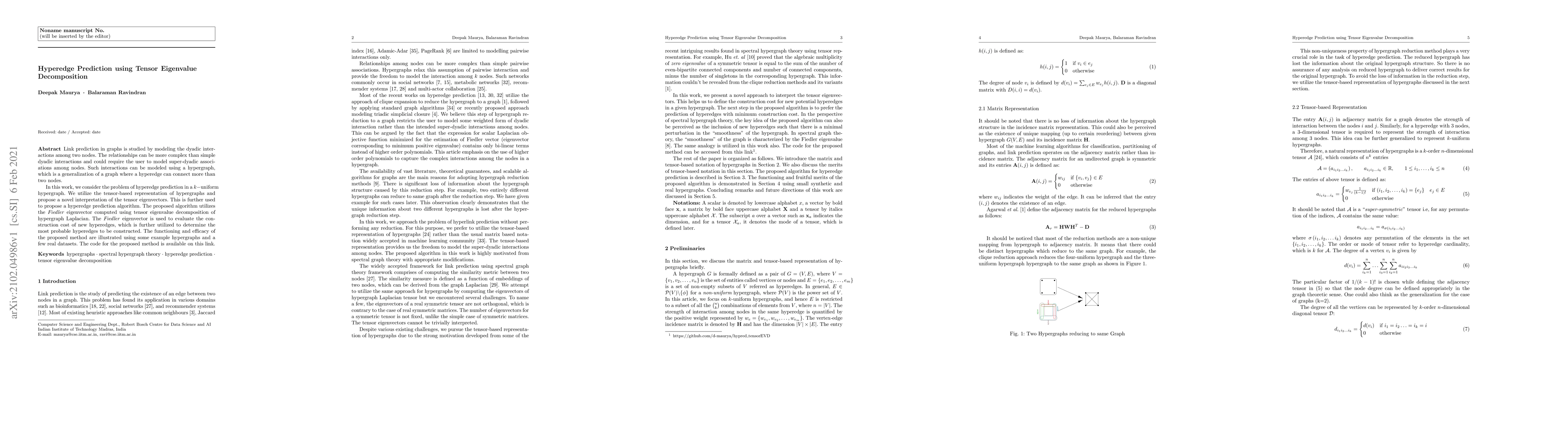 This paper proposes a novel hyperedge prediction algorithm for $k$-uniform hypergraphs using tensor eigenvalue decomposition. The method leverages the Fiedler eigenvector from the tensor Laplacian to evaluate potential hyperedge constructions, demonstrating effectiveness through examples and real datasets.