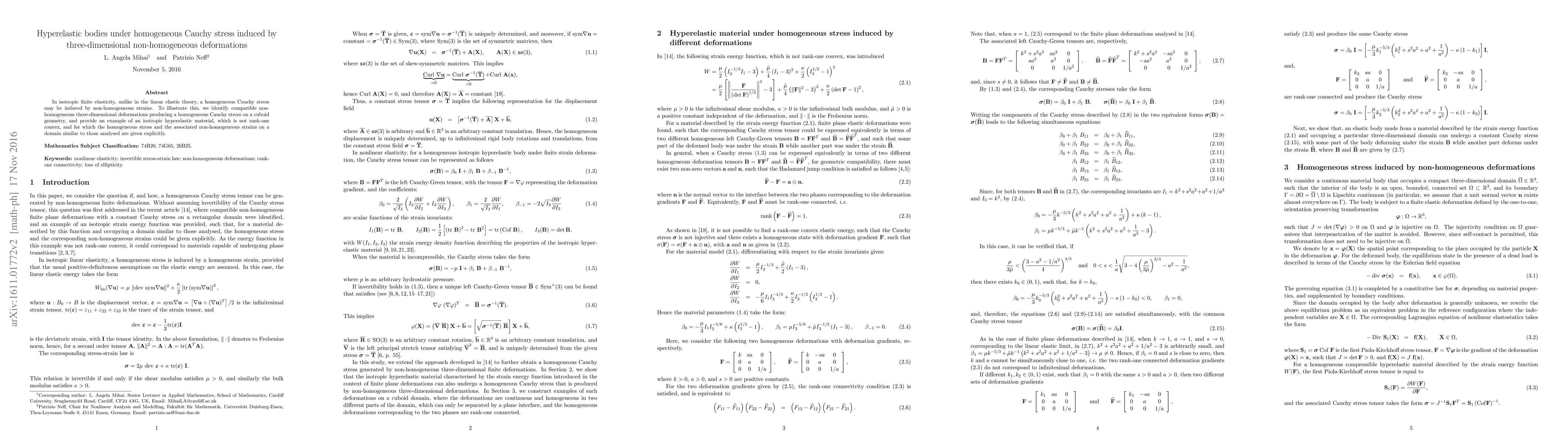 This paper explores isotropic finite elasticity where homogeneous Cauchy stress arises from non-homogeneous three-dimensional deformations. It identifies specific non-homogeneous deformations on a cuboid that induce uniform stress and provides an example of a non-rank-one convex hyperelastic material with explicit stress-strain relationships.