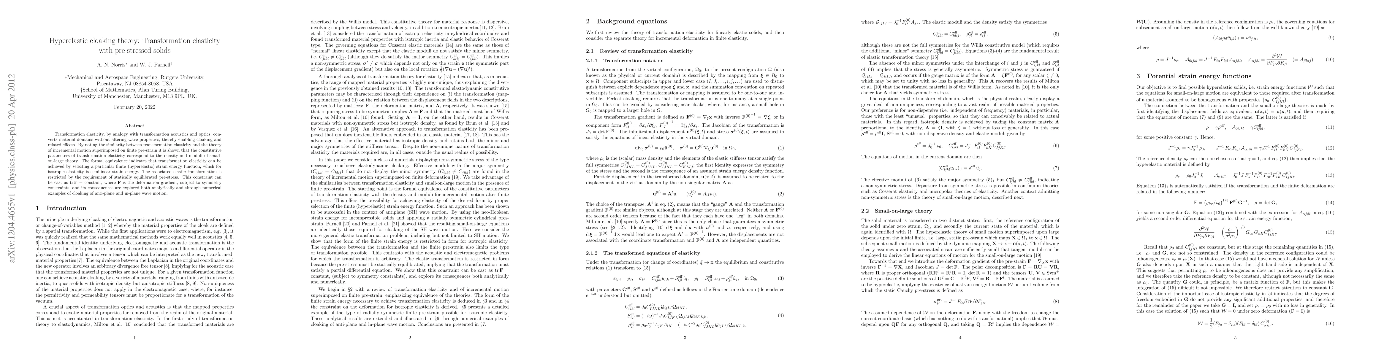 This paper explores the concept of hyperelastic cloaking using transformation elasticity, demonstrating that cloaking can be achieved through a specific finite pre-stressed strain energy function. The study reveals the equivalence between transformation elasticity and incremental motion on finite pre-strain, and investigates the statically equilibrated pre-stress constraint through analytical and numerical examples.