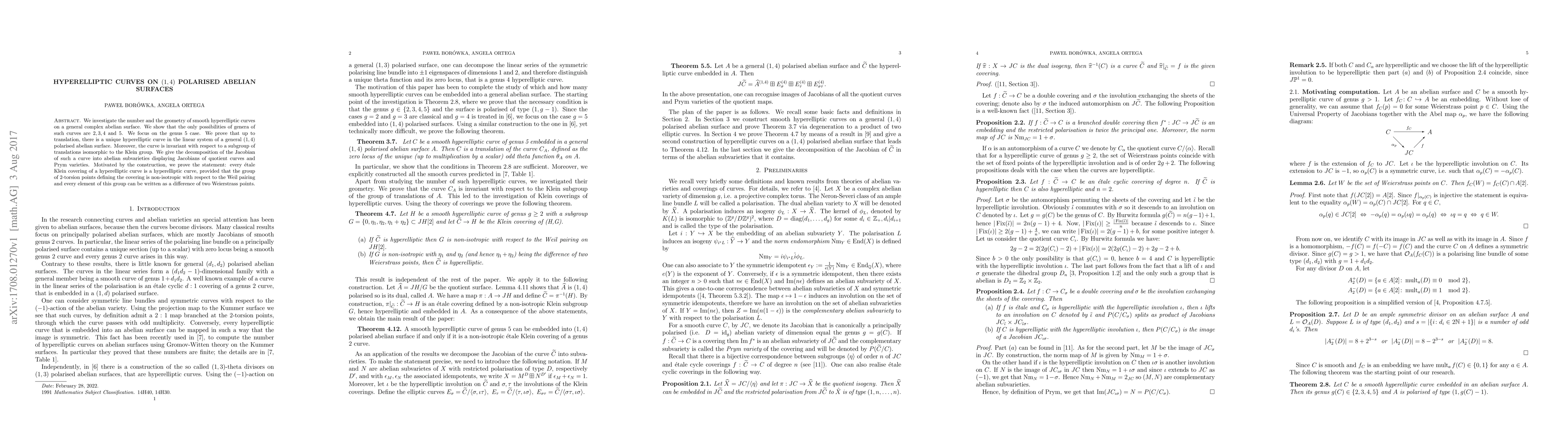 The paper investigates smooth hyperelliptic curves on complex abelian surfaces, demonstrating that their genera can only be $2, 3, 4,$ or $5$. It specifically proves that a general $(1,4)$ polarized abelian surface has a unique genus 5 hyperelliptic curve invariant under a Klein group translation, and decomposes its Jacobian into abelian subvarieties.