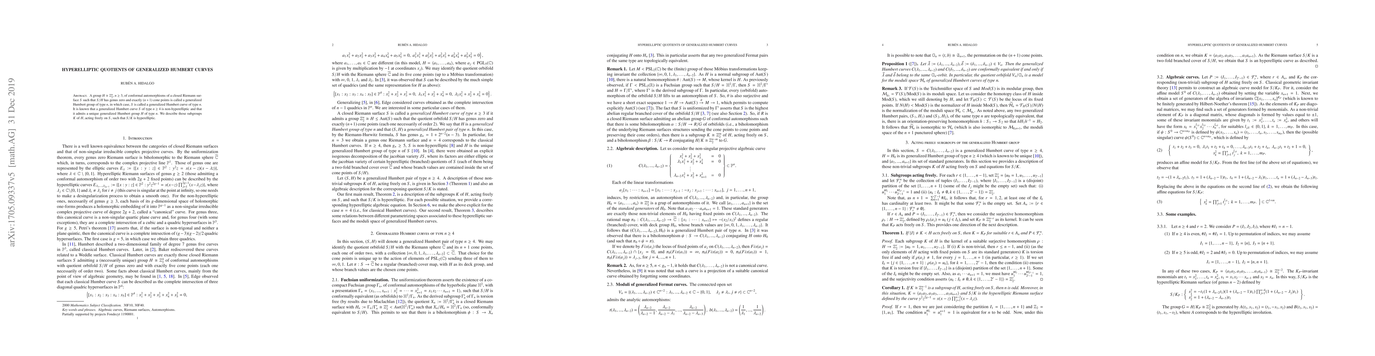 A group $H \cong {\mathbb Z}_{2}^{n}$, $n \geq 3$, of conformal automorphisms of a closed Riemann surface $S$ such that $S/H$ has genus zero and exactly $(n+1)$ cone points is called a generalized Humbert group of type $n$, in which case, $S$ is called a generalized Humbert curve of type $n$. It is known that a generalized Humbert curve $S$ of type $n \geq 4$ is non-hyperelliptic and that it admits a unique generalized Humbert group $H$ of type $n$. We describe those subgroups $K$ of $H$, acting freely on $S$, such that $S/K$ is hyperelliptic.