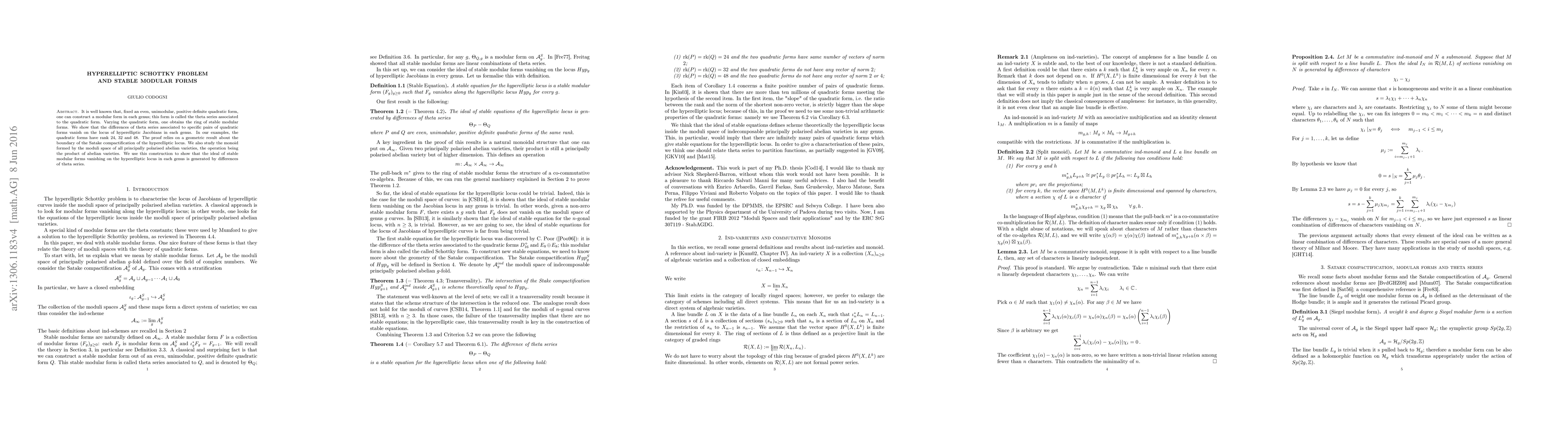 This paper demonstrates that differences of theta series associated with specific pairs of quadratic forms vanish on the locus of hyperelliptic Jacobians, revealing a connection to stable modular forms. The proof hinges on a geometric result about the boundary of the Satake compactification and shows that the ideal of stable modular forms vanishing on the hyperelliptic locus is generated by these differences.
