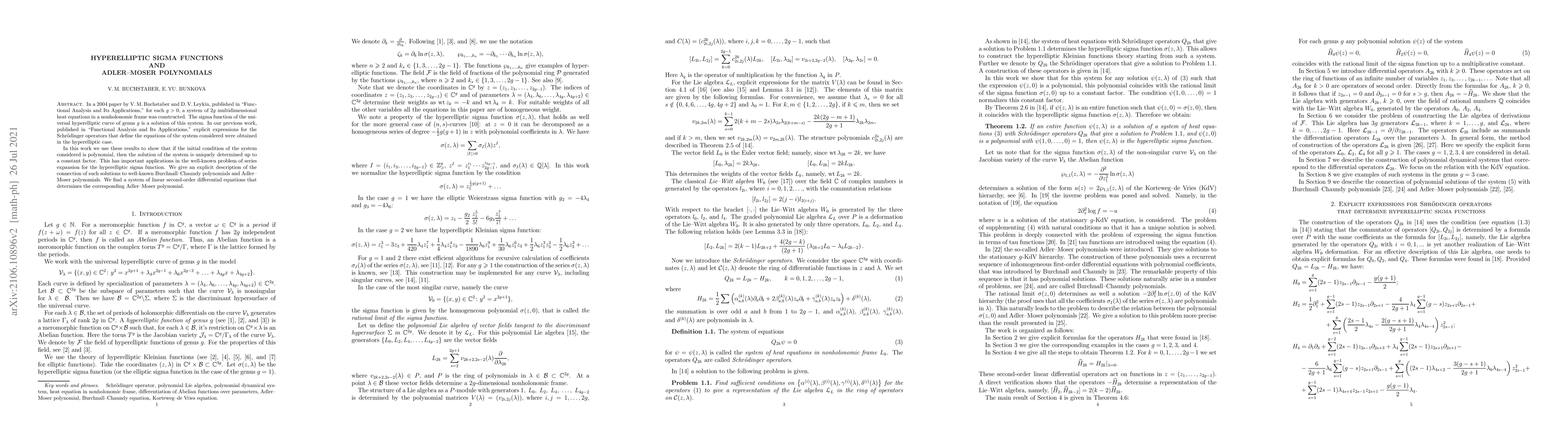 In a 2004 paper by V. M. Buchstaber and D. V. Leykin, published in "Functional Analysis and Its Applications," for each $g > 0$, a system of $2g$ multidimensional heat equations in a nonholonomic frame was constructed. The sigma function of the universal hyperelliptic curve of genus $g$ is a solution of this system. In the work arXiv:2007.08966 explicit expressions for the Schr\"odinger operators that define the equations of the system considered were obtained in the hyperelliptic case. In this work we use these results to show that if the initial condition of the system considered is polynomial, then the solution of the system is uniquely determined up to a constant factor. This has important applications in the well-known problem of series expansion for the hyperelliptic sigma function. We give an explicit description of the connection of such solutions to well-known Burchnall-Chaundy polynomials and Adler-Moser polynomials. We find a system of linear second-order differential equations that determines the corresponding Adler-Moser polynomial.