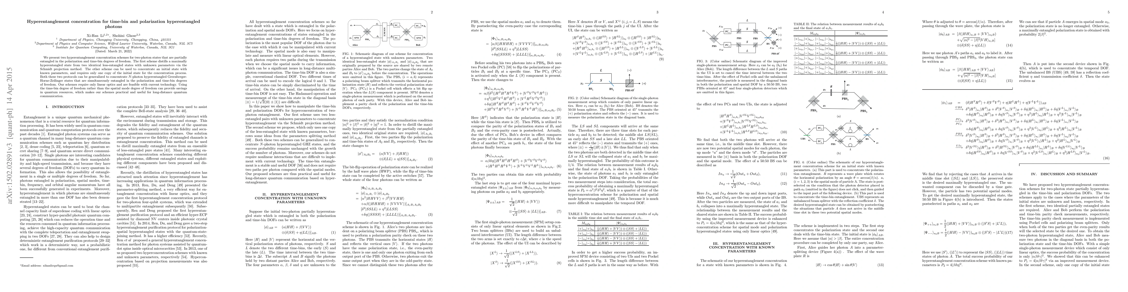 This paper proposes two schemes for hyperentanglement concentration of time-bin and polarization entangled photons, utilizing linear optics. The first scheme distills a maximally hyperentangled state from two partially entangled states, while the second requires only one copy of the initial state. Both methods are practical for long-distance quantum communication due to resource efficiency.