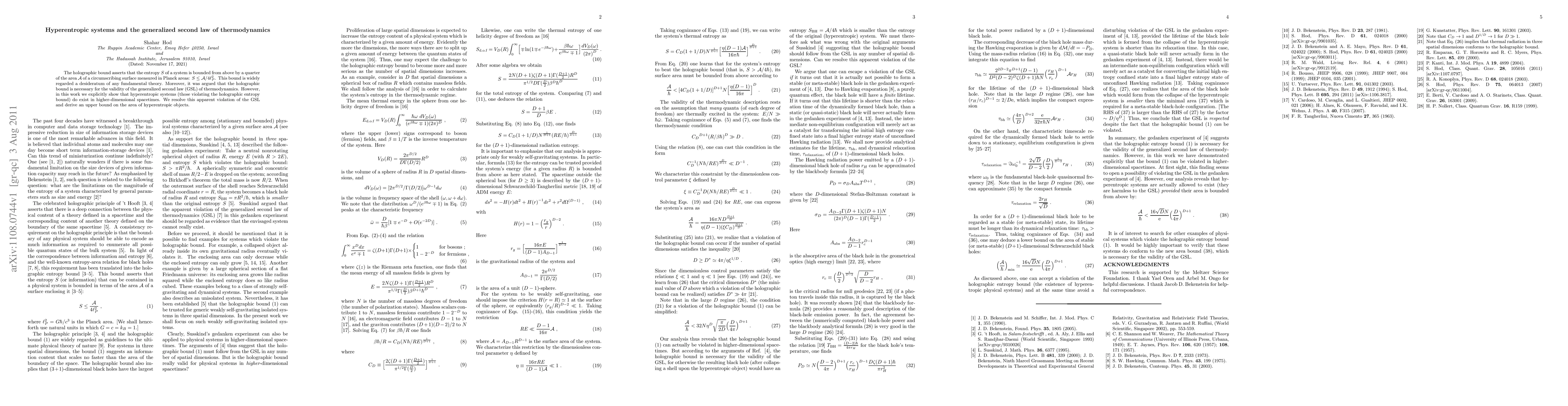 The holographic bound asserts that the entropy $S$ of a system is bounded from above by a quarter of the area ${\cal A}$ of a circumscribing surface measured in Planck areas: $S\leq {\cal A}/4{\ell^2_P}$. This bound is widely regarded a desideratum of any fundamental theory. Moreover, it was argued that the holographic bound is necessary for the validity of the generalized second law (GSL) of thermodynamics. However, in this work we explicitly show that hyperentropic systems (those violating the holographic entropy bound) do exist in higher-dimensional spacetimes. We resolve this apparent violation of the GSL and derive an upper bound on the area of hyperentropic objects.