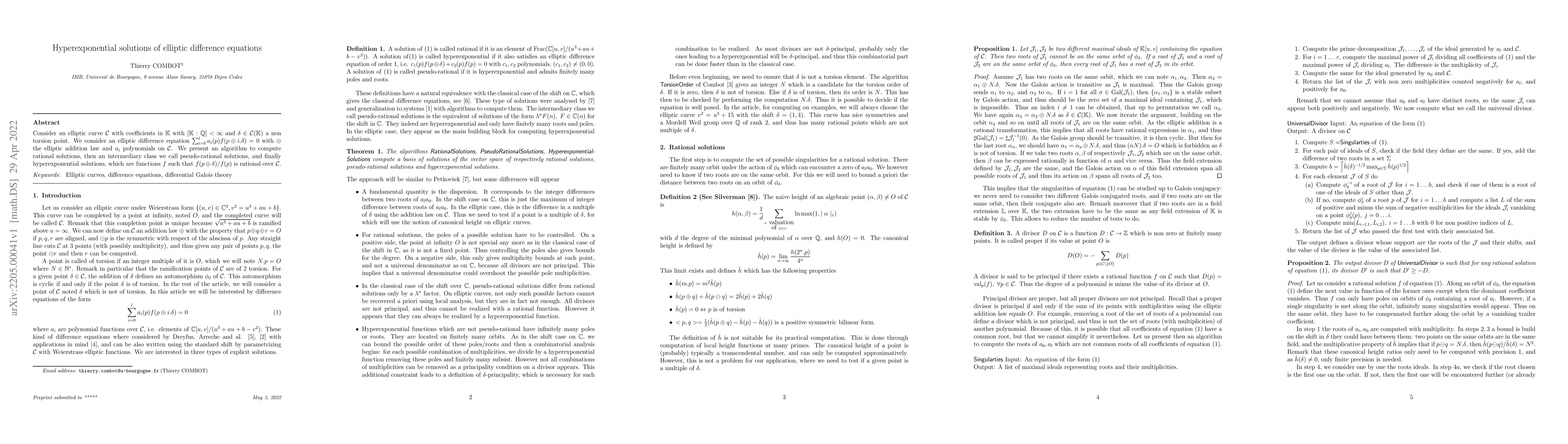 Consider an elliptic curve $\mathcal{C}$ with coefficients in $\mathbb{K}$ with $[\mathbb{K}:\mathbb{Q}]<\infty$ and $\delta \in \mathcal{C}(\mathbb{K})$ a non torsion point. We consider an elliptic difference equation $\sum_{i=0}^l a_i(p) f(p\oplus i.\delta)=0$ with $\oplus$ the elliptic addition law and $a_i$ polynomials on $\mathcal{C}$. We present an algorithm to compute rational solutions, then an intermediary class we call pseudo-rational solutions, and finally hyperexponential solutions, which are functions $f$ such that $f(p\oplus \delta)/f(p)$ is rational over $\mathcal{C}$.