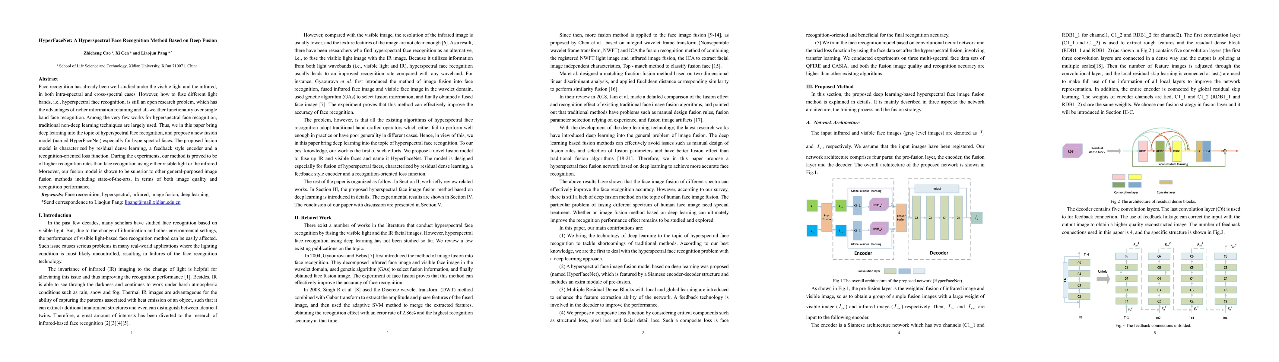 HyperFaceNet introduces a deep fusion model for hyperspectral face recognition, leveraging residual dense learning and a feedback encoder for superior recognition rates compared to traditional methods. The proposed method outperforms general image fusion techniques in both image quality and recognition performance.