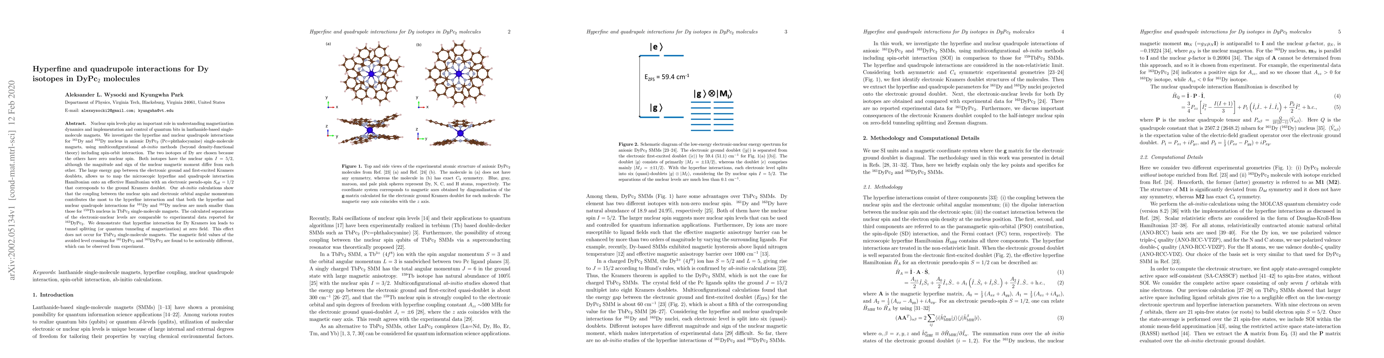 Researchers investigated hyperfine and quadrupole interactions in DyPc$_2$ single-molecule magnets using ab-initio methods, finding that these interactions lead to tunnel splitting of magnetization at zero field, a phenomenon not observed in other materials.