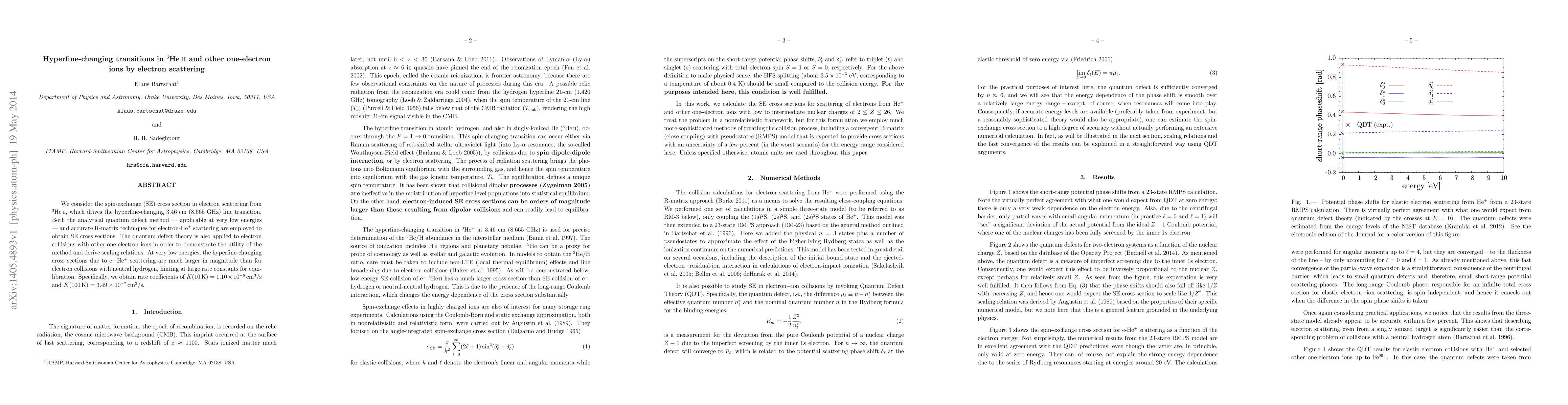 This paper investigates the spin-exchange cross section in electron scattering from $^3$He II and other one-electron ions, focusing on the hyperfine-changing transitions. It employs both quantum defect methods and R-matrix techniques to derive these cross sections, revealing significantly larger rate constants for equilibration at low energies compared to neutral hydrogen.