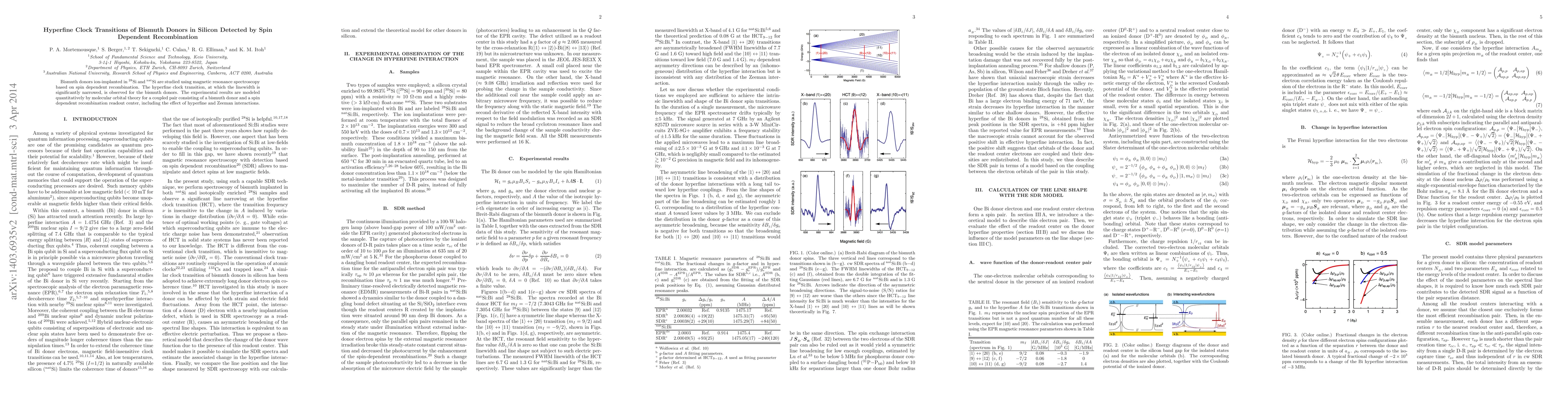 This study investigates bismuth donors in silicon using magnetic resonance spectroscopy, observing a narrowed hyperfine clock transition via spin-dependent recombination. The results are quantitatively modeled using molecular orbital theory, accounting for hyperfine and Zeeman interactions in a coupled bismuth donor-readout center pair.