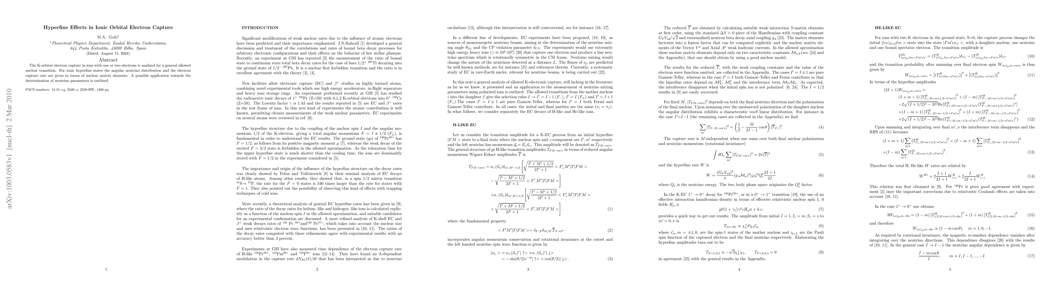 The K-orbital electron capture in ions with one or two electrons is analized for a general allowed nuclear transition. For ionic hyperfine states the angular neutrino distribution and the electron capture rate are given in terms of nuclear matrix elements. A possible application towards the determination of neutrino parameters is outlined.