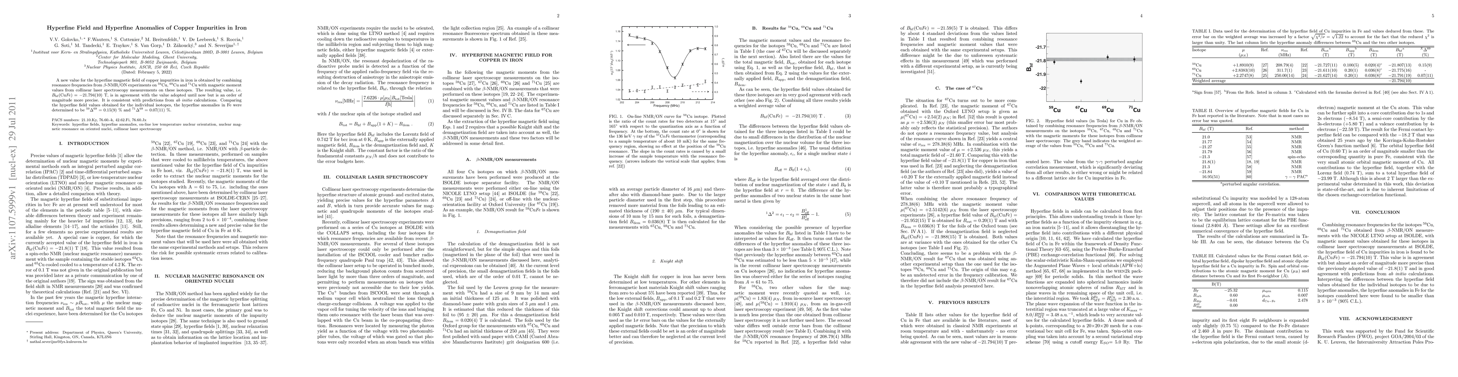 The paper presents a highly precise measurement of the hyperfine magnetic field of copper impurities in iron, Bhf(CuFe) = -21.794(10) T, obtained by combining {eta}-NMR and laser spectroscopy data. This value aligns with previous estimates and theoretical predictions. The study also determined hyperfine anomalies between copper isotopes in iron, finding 59{Delta}69=0.15(9)% and 71{Delta}69=0.07(11)%.