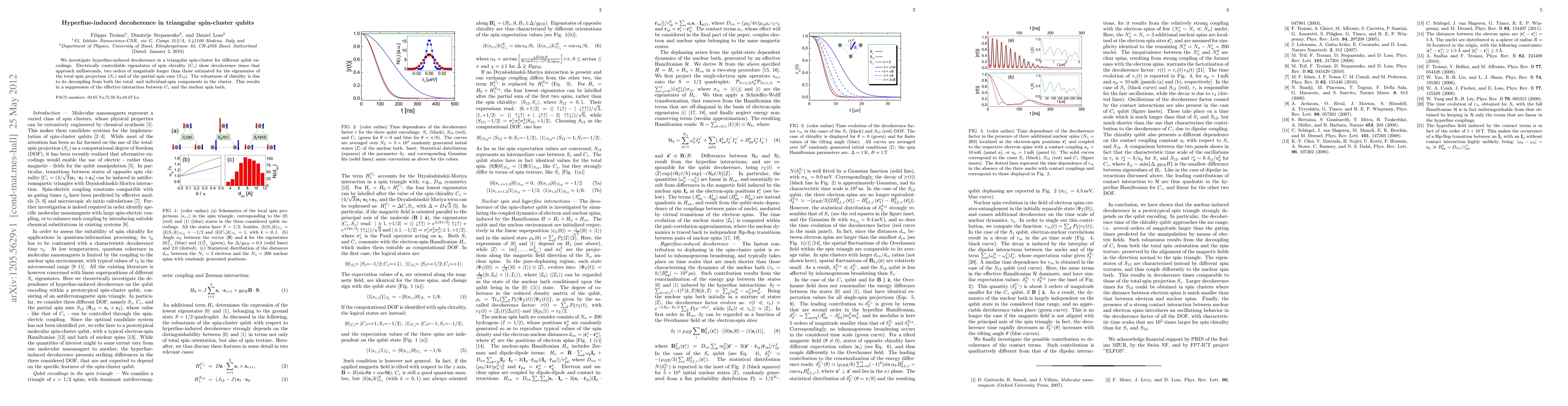 This paper examines the hyperfine-induced decoherence in triangular spin-cluster qubits, finding that eigenstates of spin chirality (C_z) exhibit decoherence times up to milliseconds, significantly longer than those of total spin projection (S_z) and partial spin sum (S_{12}). The enhanced robustness of chirality is attributed to its decoupling from total and individual spin components, leading to reduced interaction with the nuclear spin bath.