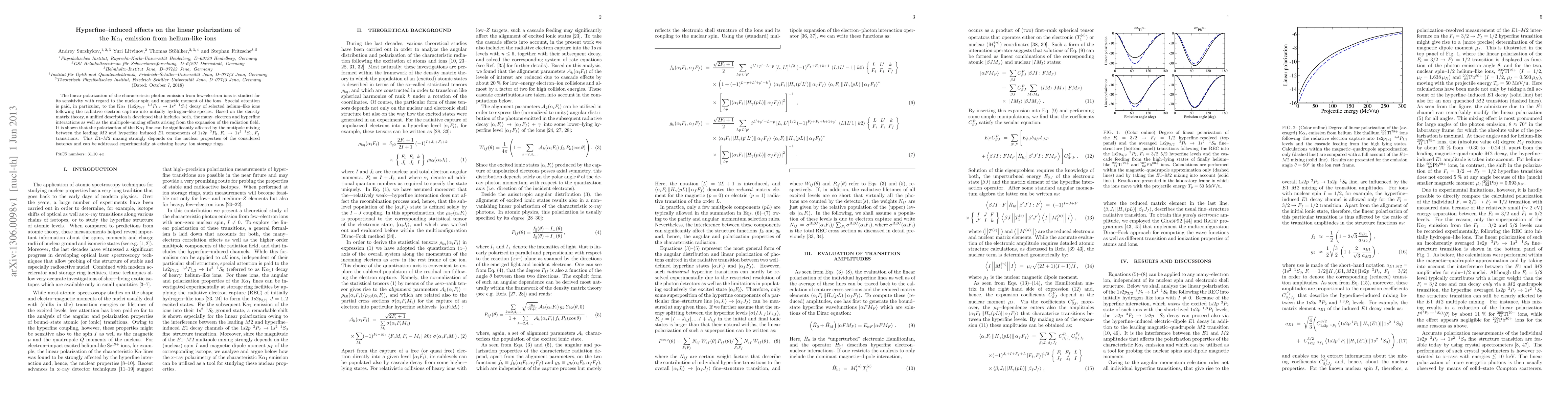 The linear polarization of the characteristic photon emission from few-electron ions is studied for its sensitivity with regard to the nuclear spin and magnetic moment of the ions. Special attention is paid, in particular, to the K$\alpha_1$ ($1s 2p_{3/2} ^{1,3}P_{1,2} \to 1s^2 ^1S_0$) decay of selected helium-like ions following the radiative electron capture into initially hydrogen-like species. Based on the density matrix theory, a unified description is developed that includes both, the many-electron and hyperfine interactions as well as the multipole-mixing effects arising from the expansion of the radiation field. It is shown that the polarization of the K$\alpha_1$ line can be significantly affected by the mutipole mixing between the leading $M2$ and hyperfine-induced $E1$ components of $1s2p ^3P_2, F_i \to 1s^2 ^1S_0, F_f$ transitions. This $E1$-$M2$ mixing strongly depends on the nuclear properties of the considered isotopes and can be addressed experimentally at existing heavy-ion storage rings.