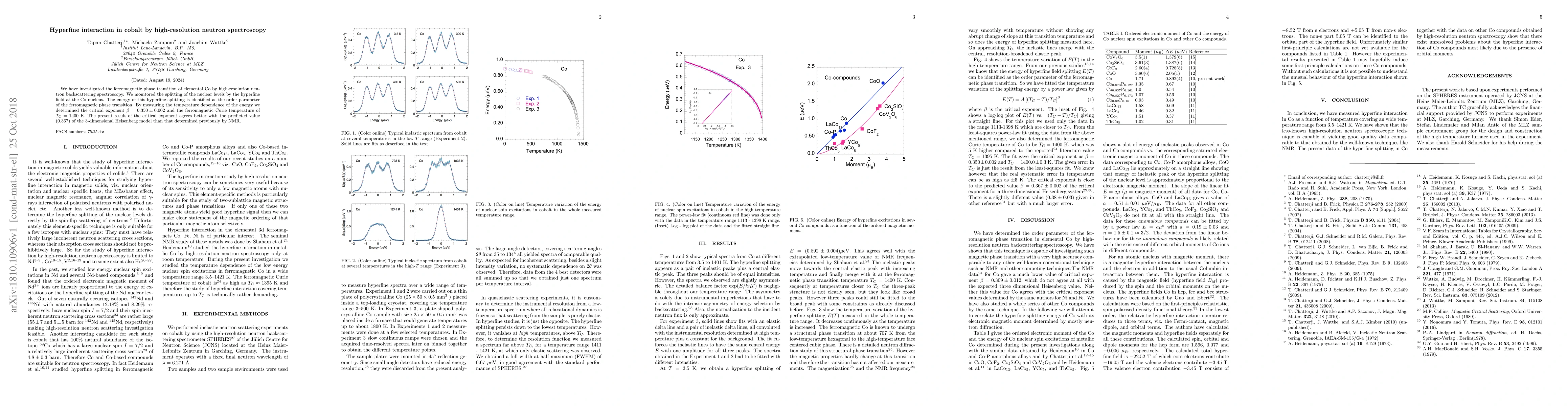This study uses high-resolution neutron backscattering spectroscopy to examine the ferromagnetic phase transition in cobalt. The researchers identified the hyperfine splitting at the Co nucleus as the order parameter, determining the critical exponent β = 0.350 ± 0.002 and the Curie temperature (Tc) = 1400 K. Their critical exponent value aligns better with theoretical predictions than previous NMR measurements.