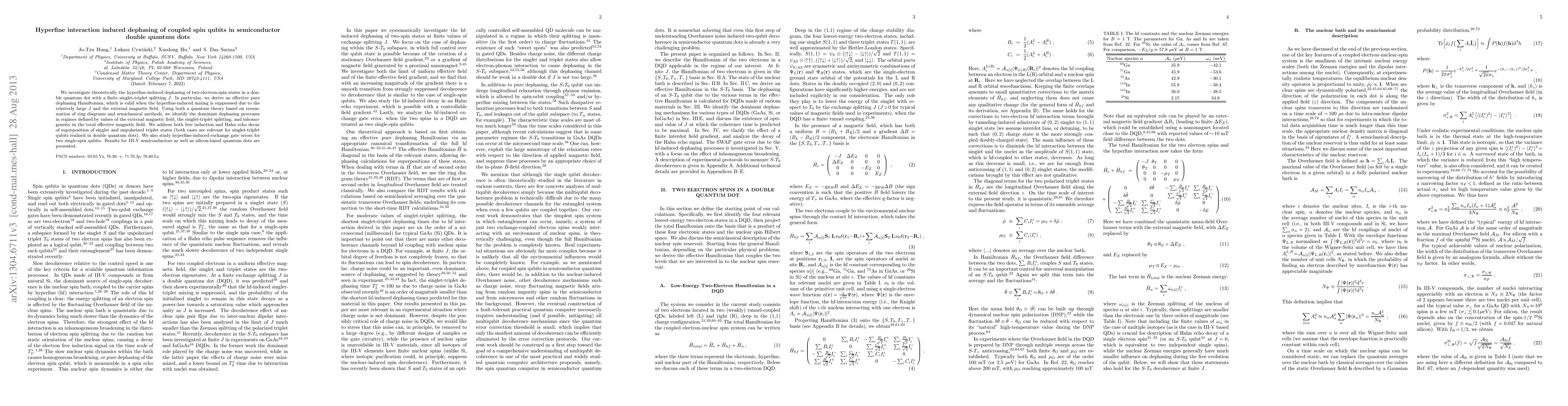 This paper theoretically explores hyperfine-induced dephasing in coupled spin qubits within semiconductor double quantum dots, deriving an effective pure dephasing Hamiltonian valid under specific conditions. It identifies dominant dephasing processes influenced by external magnetic fields and examines both free induction and Hahn echo decay relevant for singlet-triplet qubits, alongside hyperfine-induced exchange gate errors.