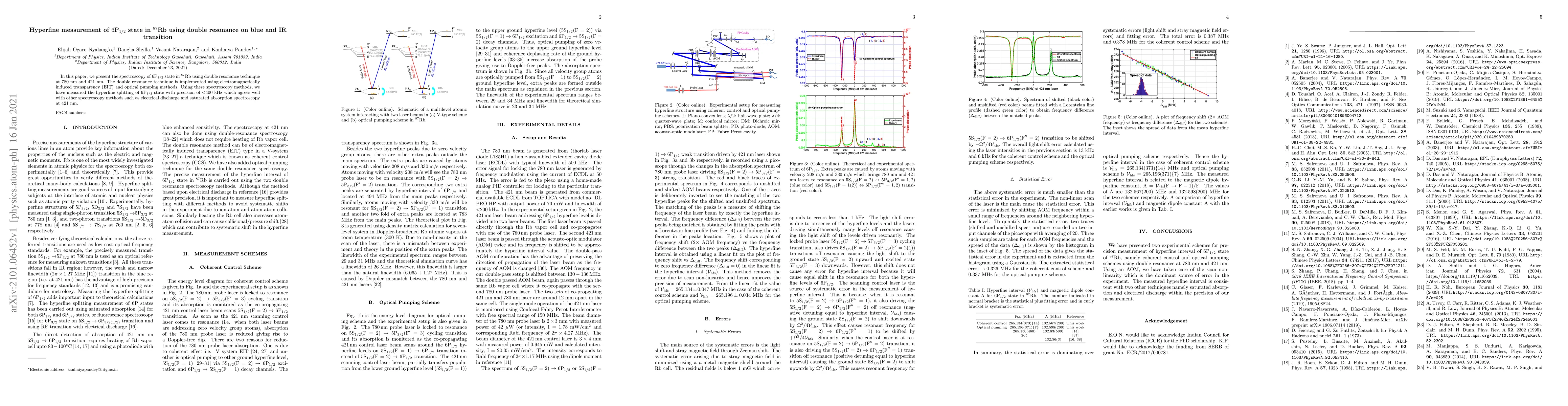 In this paper, we present the spectroscopy of 6P$_{1/2}$ state in $^{87}$Rb using double resonance technique at $780~\text{nm}$ and $421~\text{nm}$. The double resonance technique is implemented using electromagnetically induced transparency (EIT) and optical pumping methods. Using these spectroscopy methods, we have measured the hyperfine splitting of 6P$_{1/2}$ state with precision of $<$400~kHz which agrees well with other spectroscopy methods such as electrical discharge and saturated absorption spectroscopy at $421~\text{nm}$.