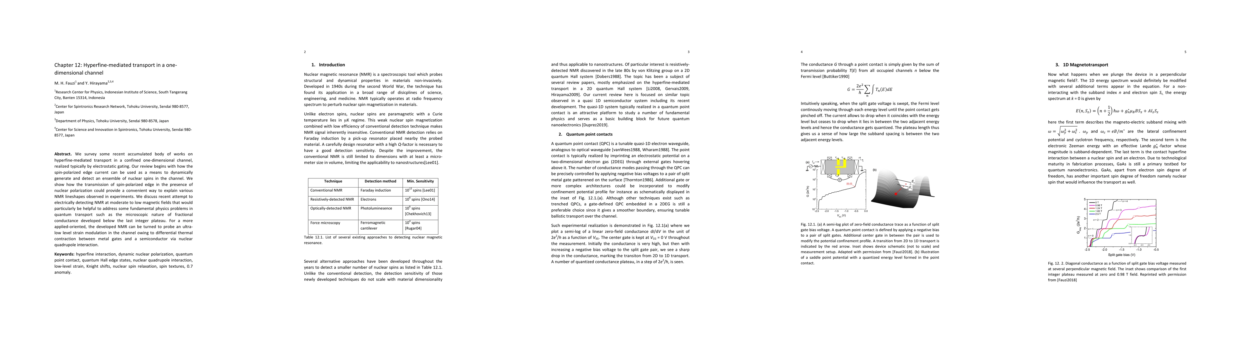 We survey some recent accumulated body of works on hyperfine-mediated transport in a confined one-dimensional channel, realized typically by electrostatic gating. Our review begins with how the spin-polarized edge current can be used as a means to dynamically generate and detect an ensemble of nuclear spins in the channel. We show how the transmission of spin-polarized edge in the presence of nuclear polarization could provide a convenient way to explain various NMR lineshapes observed in experiments. We discuss recent attempt to electrically detecting NMR at moderate to low magnetic fields that would particularly be helpful to address some fundamental physics problems in quantum transport such as the microscopic nature of fractional conductance developed below the last integer plateau. For a more applied-oriented, the developed NMR can be turned to probe an ultra-low level strain modulation in the channel owing to differential thermal contraction between metal gates and a semiconductor via nuclear quadrupole interaction.