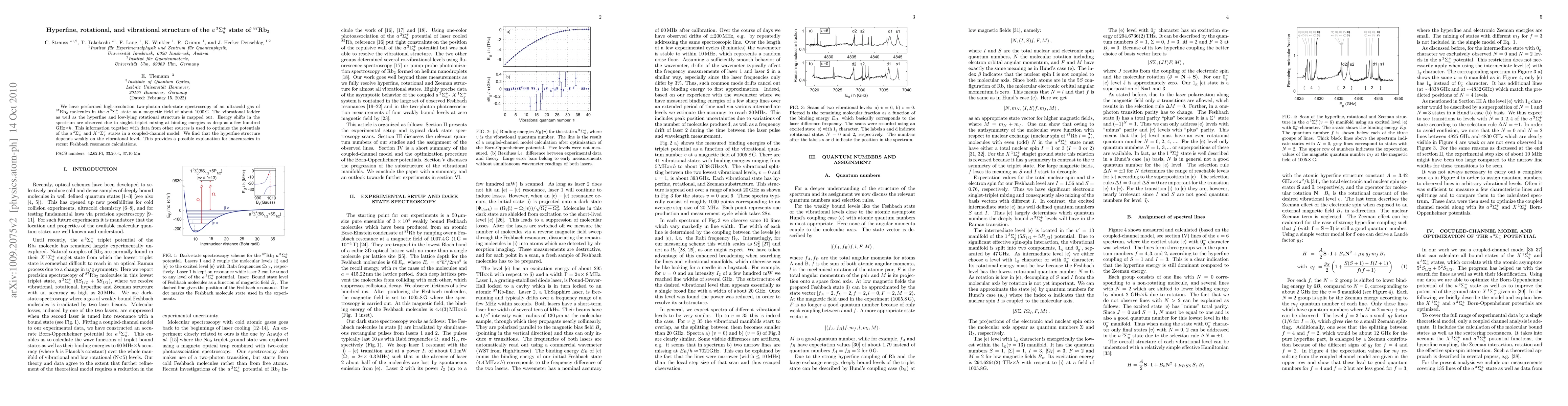 We have performed high-resolution two-photon dark-state spectroscopy of an ultracold gas of Rb molecules in the triplet ground state at a magnetic field of about 1000 G. The vibrational ladder as well as the hyperfine and low-lying rotational structure is mapped out. Energy shifts in the spectrum are observed due to singlet-triplet mixing at binding energies as deep as a few hundred GHz x h. This information together with data from other sources is used to optimize the potentials of the triplet and singlet states in a coupled-channel model. We find that the hyperfine structure depends weakly on the vibrational level. This provides a possible explanation for inaccuracies in recent Feshbach resonance calculations.