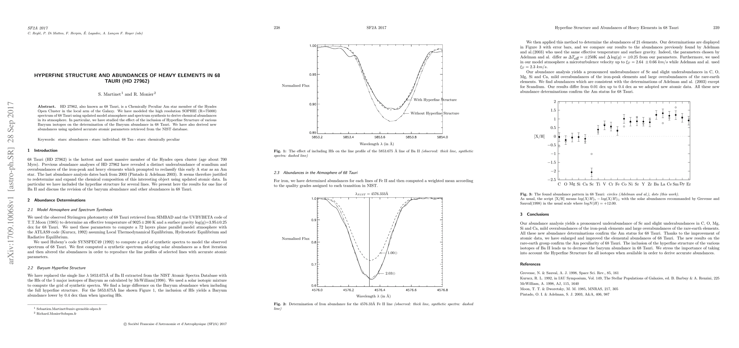 HD 27962, also known as 68 Tauri, is a Chemically Peculiar Am star member of the Hyades Open Cluster in the local arm of the Galaxy. We have modeled the high resolution SOPHIE (R=75000) spectrum of 68 Tauri using updated model atmosphere and spectrum synthesis to derive chemical abundances in its atmosphere. In particular, we have studied the effect of the inclusion of Hyperfine Structure of various Baryum isotopes on the determination of the Baryum abundance in 68 Tauri. We have also derived new abundances using updated accurate atomic parameters retrieved from the NIST database.