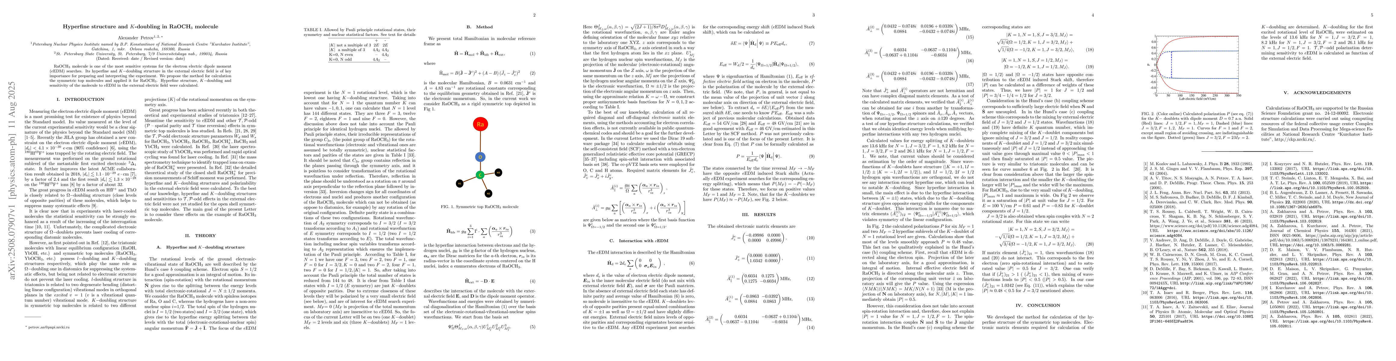 RaOCH$_3$ molecule is one of the most sensitive systems for the electron electric dipole moment ($e$EDM) searches. Its hyperfine and $K-$doubling structure in the external electric field is of key importance for preparing and interpreting the experiment. We propose the method for calculation the symmetric top molecules and applied it for RaOCH$_3$. Hyperfine structure, $K-$doubling and sensitivity of the molecule to $e$EDM in the external electric field were calculated.