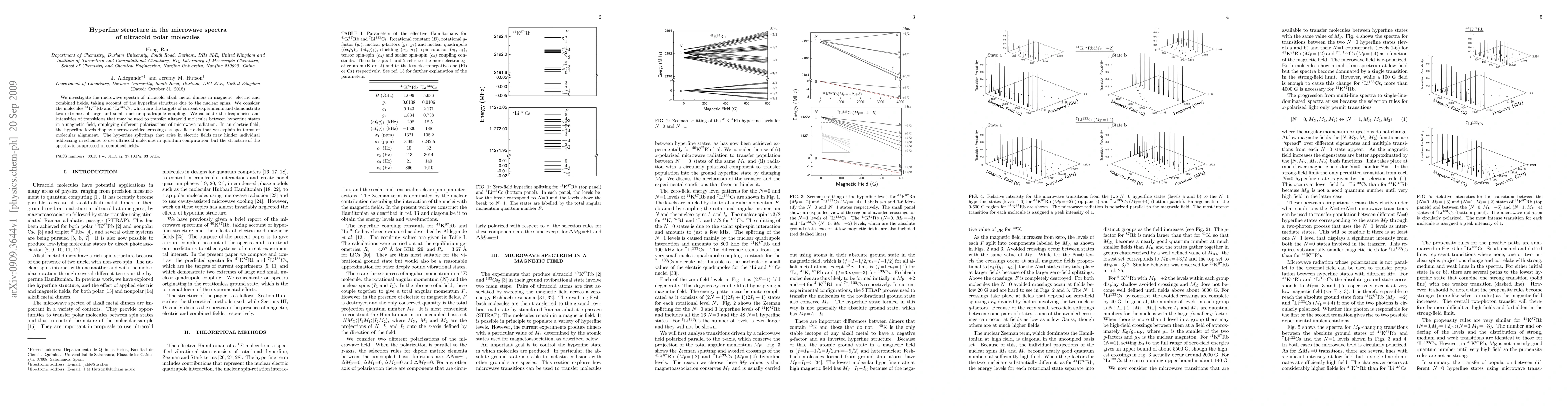 This paper investigates microwave spectra of ultracold alkali metal dimers, focusing on hyperfine structures due to nuclear spins, and calculates transition frequencies for potential use in quantum computation. It highlights the effects of magnetic and electric fields on hyperfine levels and suggests that combined fields may mitigate these effects.