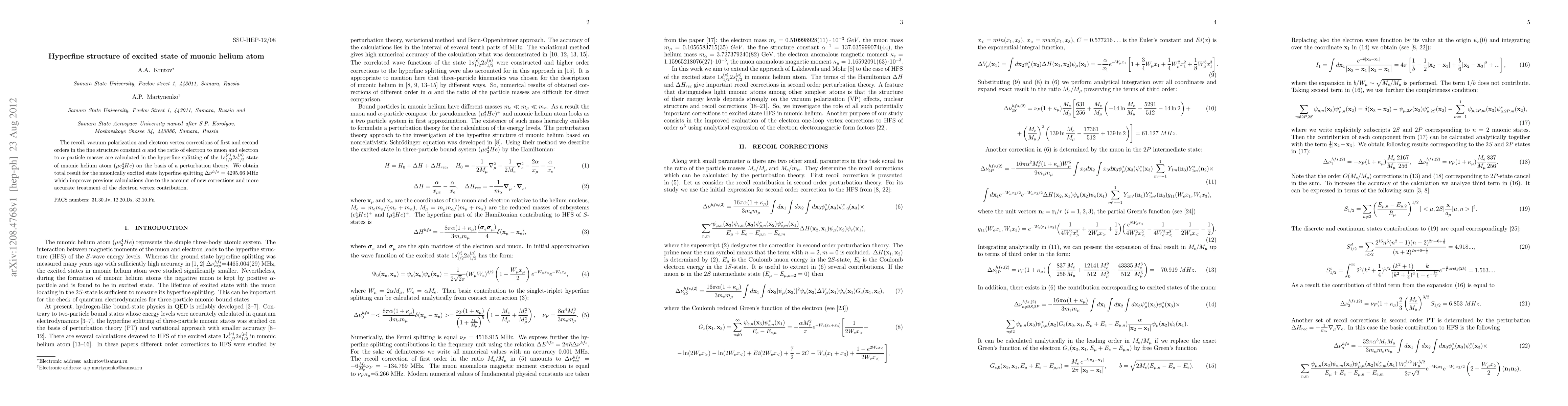 This paper calculates the hyperfine splitting of the $1s^{(e)}_{1/2}2s^{(\mu)}_{1/2}$ state in muonic helium, incorporating recoil, vacuum polarization, and electron vertex corrections. The result, $\Delta \nu^{hfs} = 4295.66$ MHz, refines prior estimates with improved treatment of new corrections.