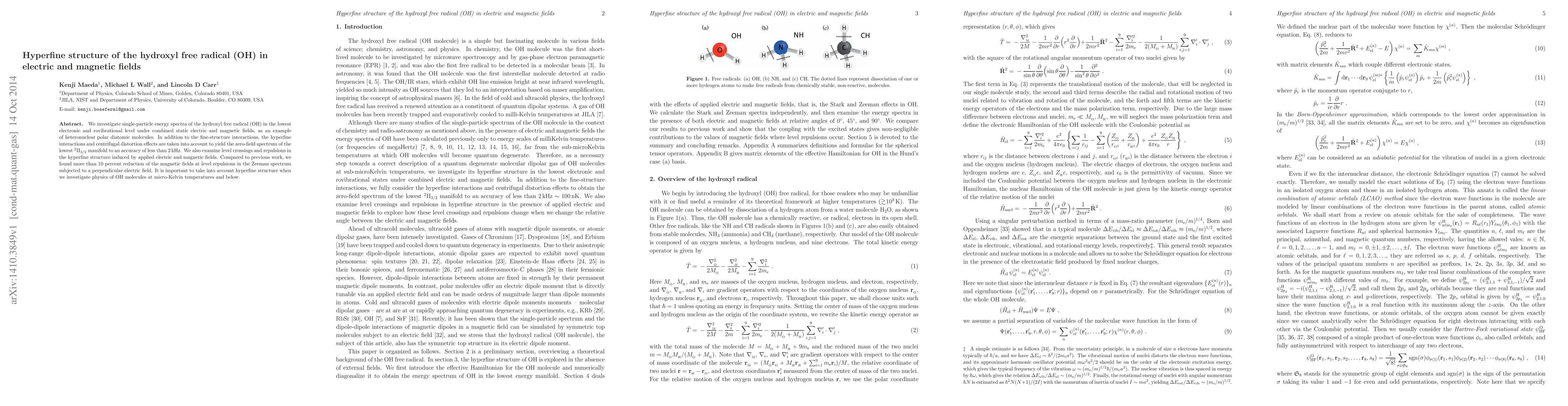 This paper investigates the energy spectra of the hydroxyl free radical (OH) under combined static electric and magnetic fields, focusing on the hyperfine structure and centrifugal distortion effects. It reveals significant reductions in magnetic field strengths at level repulsions compared to previous studies, emphasizing the importance of hyperfine structure in studying OH molecules at ultra-low temperatures.
