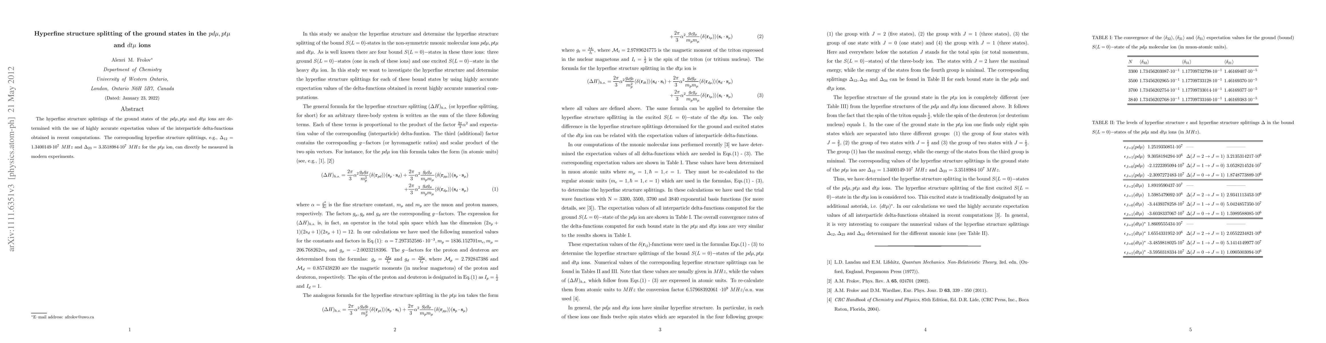 The hyperfine structure splittings of the ground states of the $pd\mu, pt\mu$ and $dt\mu$ ions are determined with the use of highly accurate expectation values of the interparticle delta-functions obtained in recent computations. The corresponding hyperfine structure splittings, e.g., $\Delta_{12} =$ 1.3400149$\cdot 10^7$ $MHz$ and $\Delta_{23} =$ 3.3518984$\cdot 10^7$ $MHz$ for the $pt\mu$ ion, can directly be measured in modern experiments.