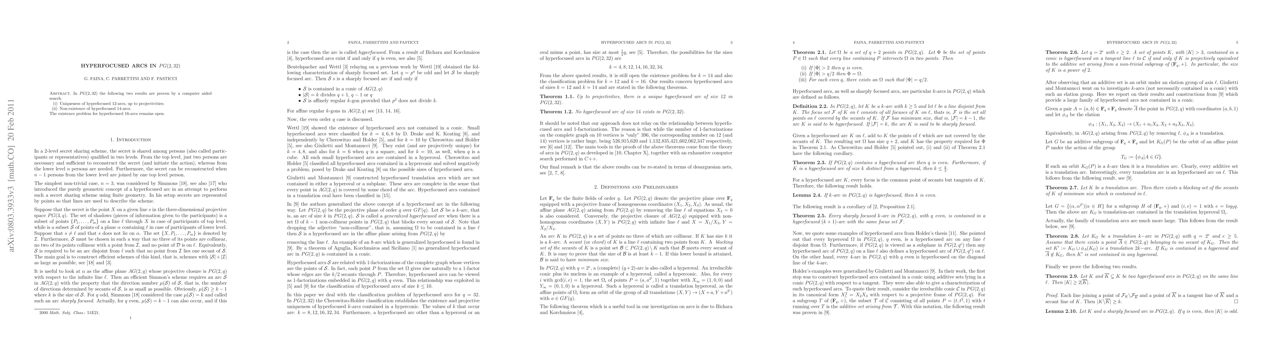 Researchers have proven the uniqueness of hyperfocused 12-arcs in PG(2,32) up to projectivities, while proving the non-existence of hyperfocused 14-arcs, leaving open the existence problem for hyperfocused 16-arcs.