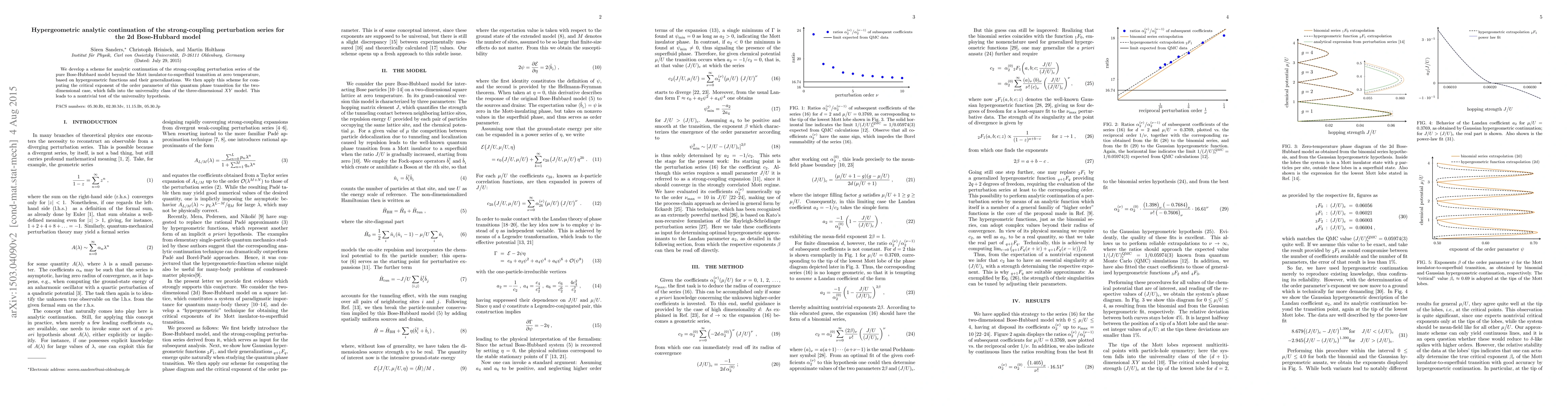 This paper presents an analytic continuation method for the strong-coupling perturbation series of the 2D Bose-Hubbard model using hypergeometric functions, enabling the study of the Mott insulator-to-superfluid transition. The method computes the critical exponent for the order parameter, testing the universality hypothesis for the 2D model's phase transition.