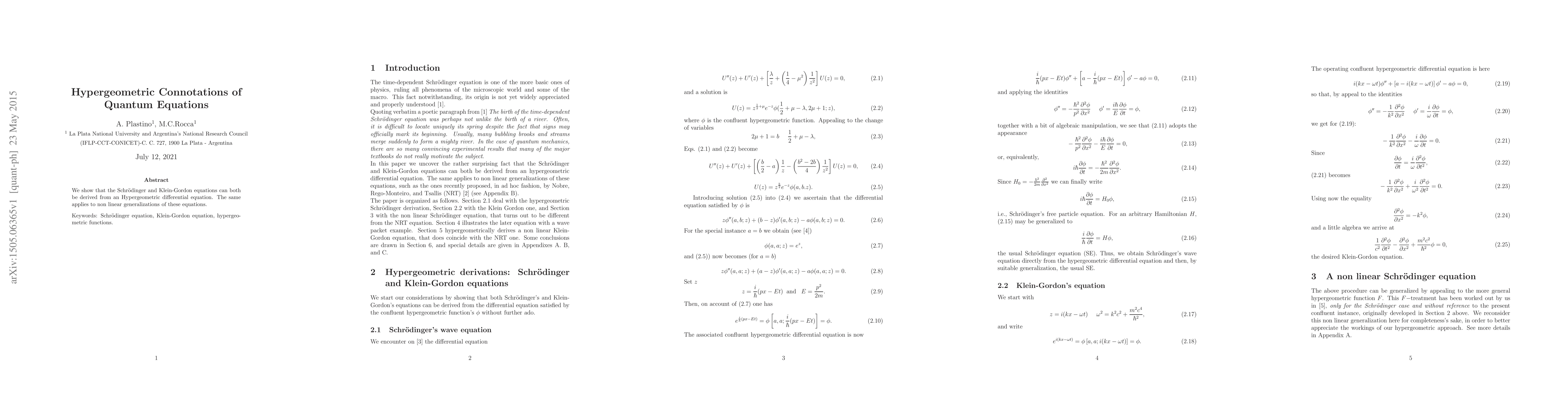 We show that the Schr\"odinger and Klein-Gordon equations can both be derived from an Hypergeometric differential equation. The same applies to non linear generalizations of these equations.