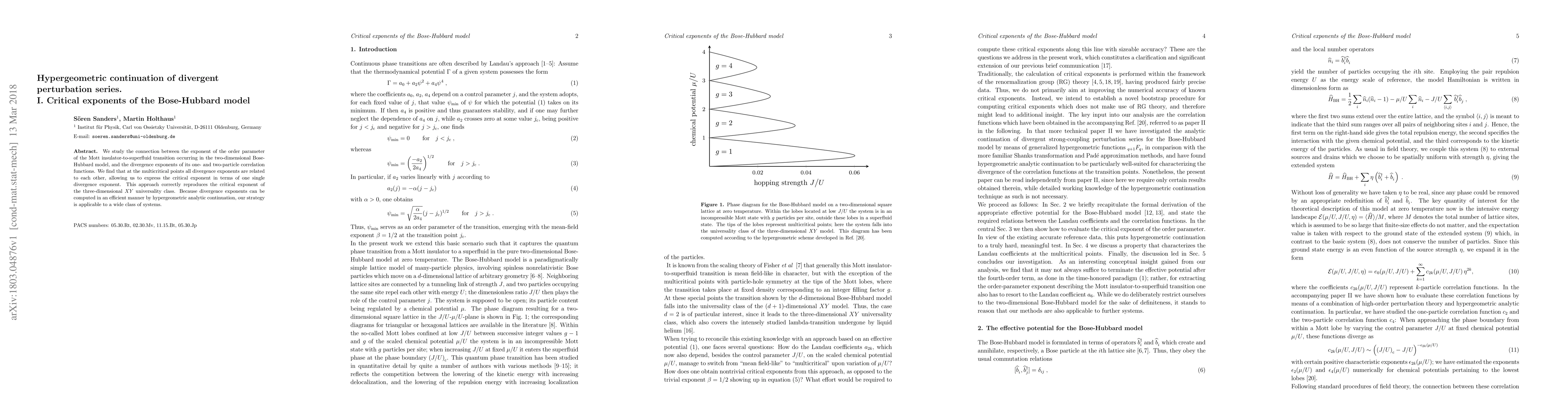 This paper explores the relationship between critical exponents in the Bose-Hubbard model and the divergence exponents of its correlation functions, revealing a unified expression for the critical exponent via hypergeometric continuation. This method, effective for computing divergence exponents, extends to various systems beyond the model.