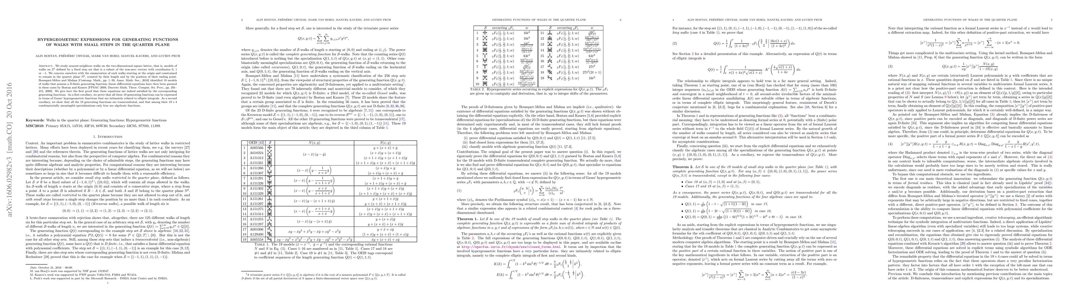 This paper proves that 19 generating functions for walk models on a two-dimensional square lattice have D-finite differential equations and can be expressed in terms of Gauss' hypergeometric functions, showing they are either algebraic or transcendental.