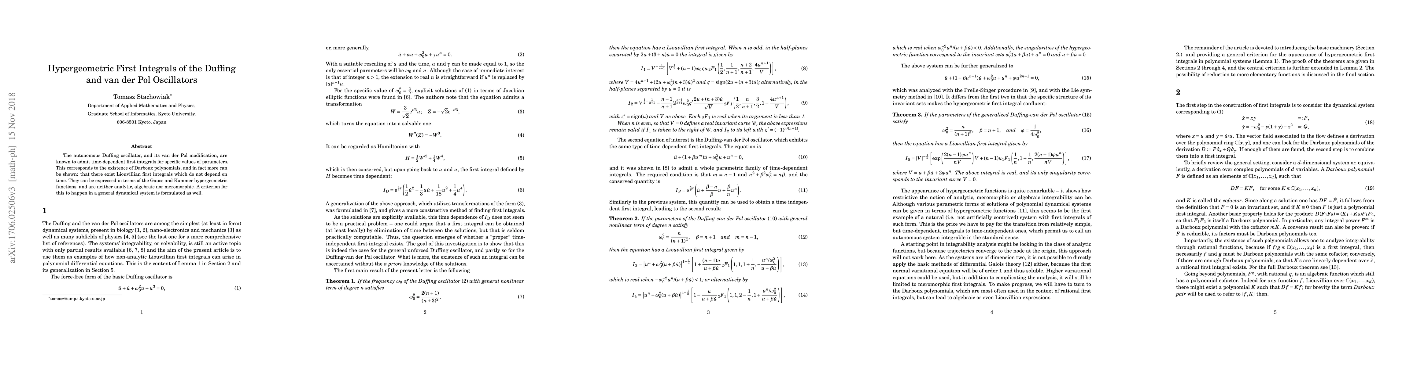 Researchers discovered non-analytic, algebraic, and meromorphic first integrals for the Duffing and van der Pol oscillators using Gauss and Kummer hypergeometric functions, providing a new criterion for their existence.