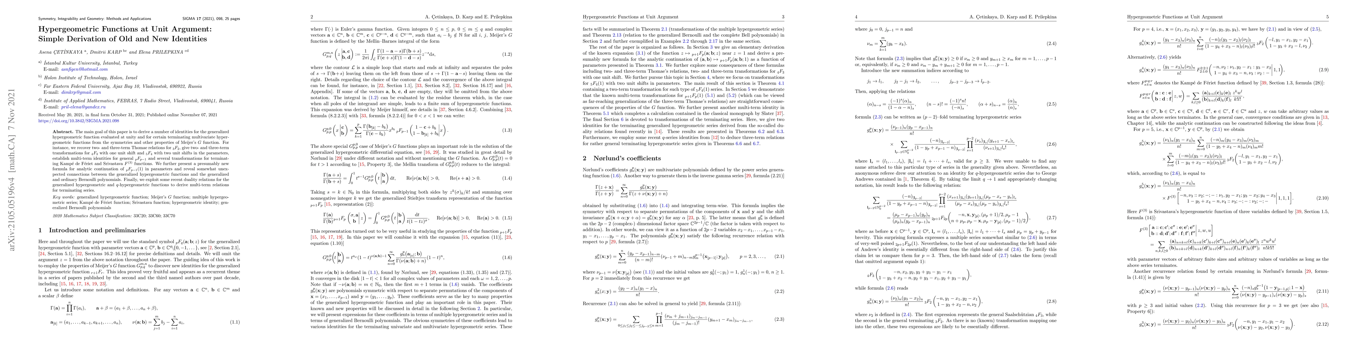 This paper derives various identities for generalized hypergeometric functions evaluated at unity, leveraging symmetries and properties of Meijer's $G$ function, including new transformations and connections to Bernoulli polynomials, and utilizes recent duality relations for $q$-hypergeometric functions.