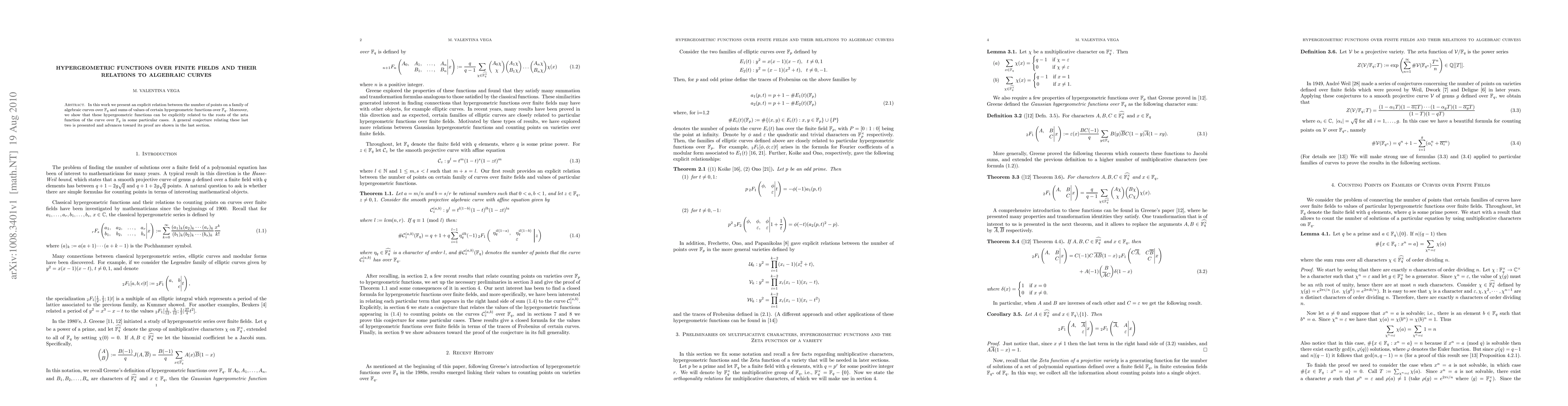 This paper establishes a connection between the number of points on algebraic curves over finite fields and sums of hypergeometric functions over the same field. It also explores the relationship between these hypergeometric functions and the roots of the zeta function of the curve, presenting a conjecture and initial proof steps.