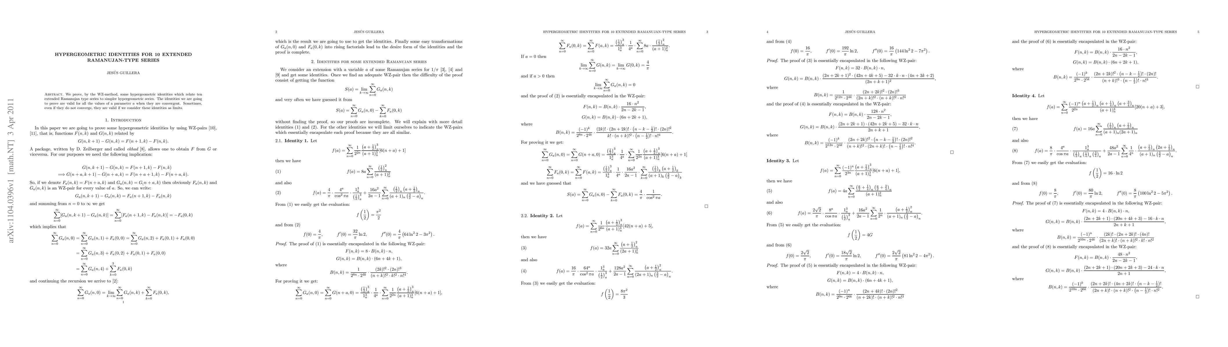 We prove, by the WZ-method, some hypergeometric identities which relate ten extended Ramanujan type series to simpler hypergeometric series. The identities we are going to prove are valid for all the values of a parameter $a$ when they are convergent. Sometimes, even if they do not converge, they are valid if we consider these identities as limits.
