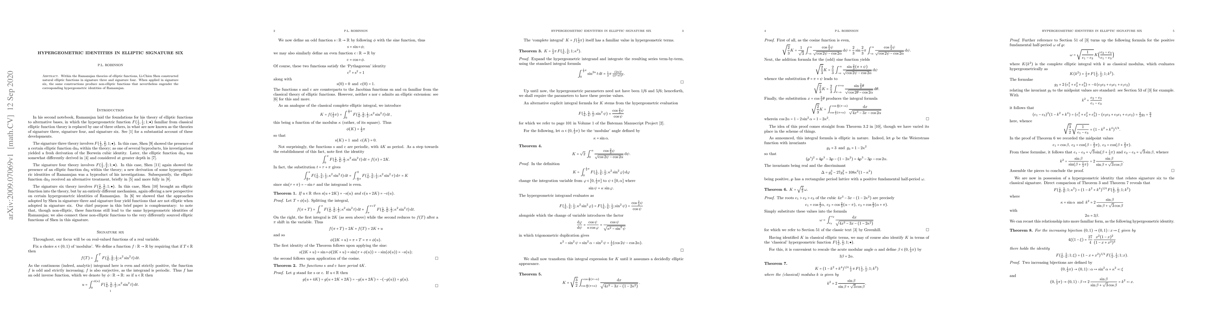 Within the Ramanujan theories of elliptic functions, Li-Chien Shen constructed natural elliptic functions in signature three and signature four. When applied in signature six, the same constructions produce non-elliptic functions that nevertheless engender the corresponding hypergeometric identities of Ramanujan.