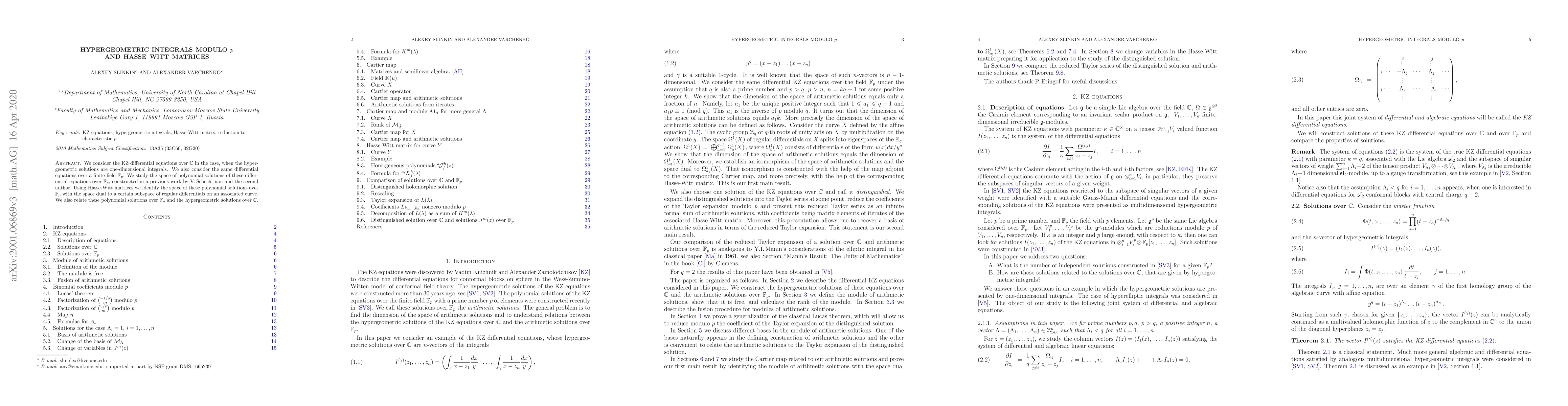 This paper explores KZ differential equations with hypergeometric solutions over both $\mathbb{C}$ and $\mathbb{F}_p$, identifying polynomial solutions over $\mathbb{F}_p$ via Hasse-Witt matrices and relating them to dual spaces of regular differentials on associated curves.