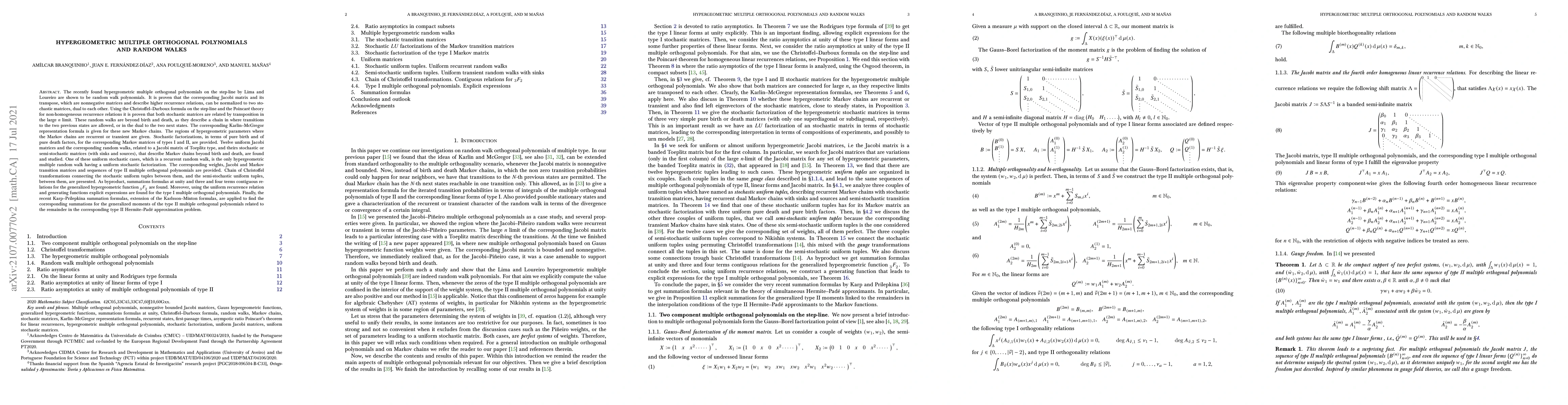 This paper connects hypergeometric multiple orthogonal polynomials on the step-line to random walk polynomials, proving that their associated Jacobi matrices can be normalized into dual stochastic matrices. The study also details Markov chains beyond birth and death processes, providing their recurrence or transience regions and stochastic factorizations.