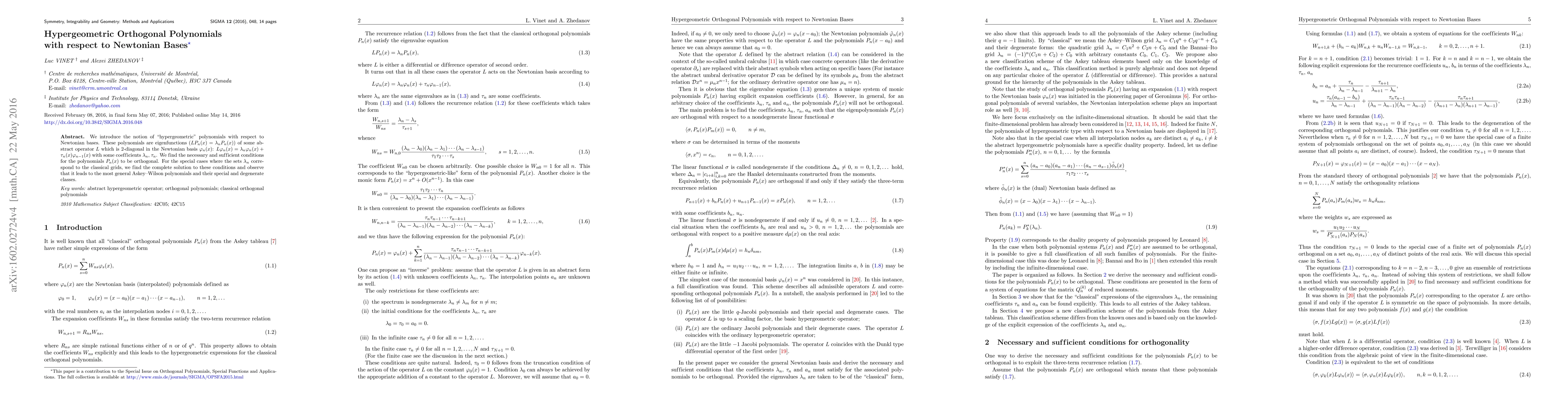 This paper introduces "hypergeometric" orthogonal polynomials defined with respect to Newtonian bases, which are eigenfunctions of a specific abstract operator. It determines the conditions for these polynomials to be orthogonal and reveals that special cases yield the most general Askey-Wilson polynomials and their subclasses.