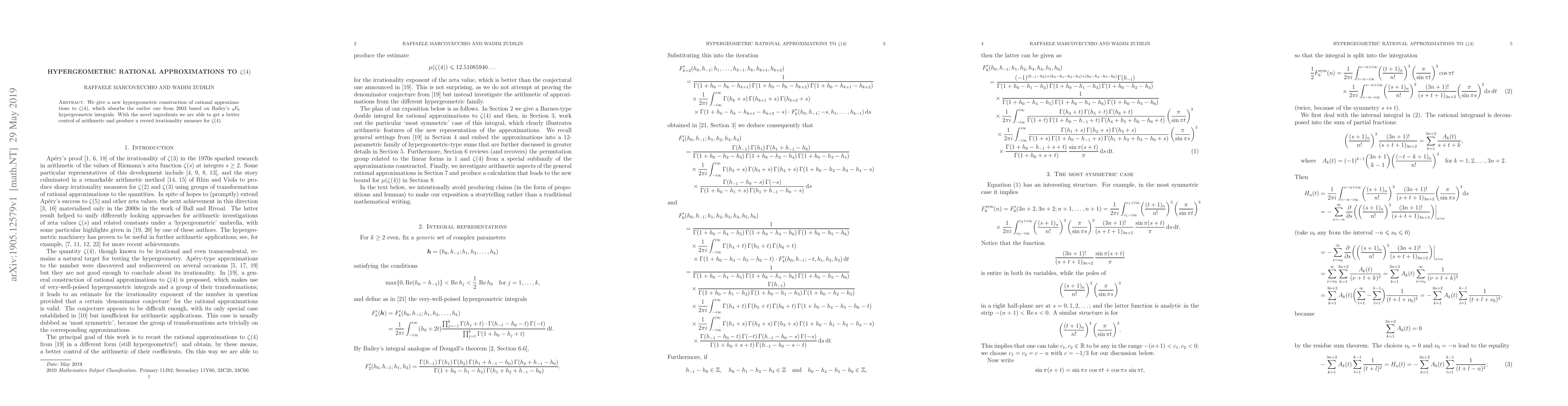 Summary: This paper presents a new hypergeometric approach for rational approximations to $\zeta(4)$, surpassing previous methods with improved arithmetic control and achieving a record irrationality measure for $\zeta(4)$.